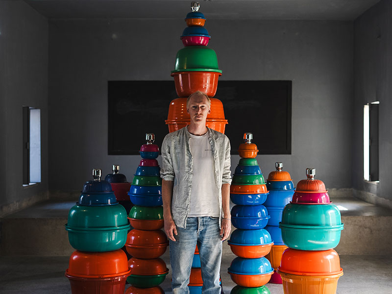Gaspard’s installation was developed during his residency with PATI in January and February 2025. His sculptural works merge megalithic references with everyday objects, exploring the tension between ancient symbols and modern artefacts, and reflecting with subtle humour on consumption, spirituality, and the pace of modern life. The production of the installation is supported by the French Institute in India, Villa Swagatam, and StoneX Global.