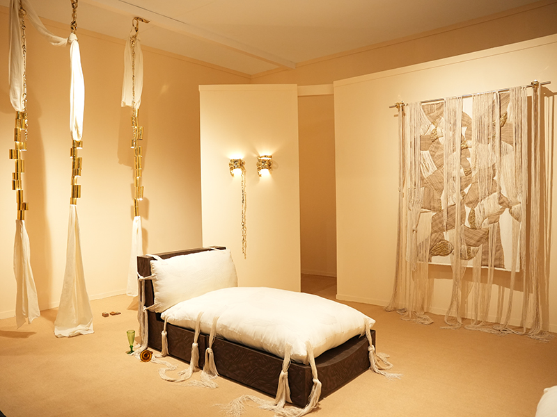 At the heart of the installation lies an embroidered core, accompanied by modular seating and sculptural lighting elements. Pearls, fastening systems and ornamental gestures drawn from childhood memory are reinterpreted as functional structures. Objects hold together through proximity, tension and care. What appears delicate reveals itself as load-bearing. What seems ornamental becomes foundational. The embroidered wall appliqué, part of the larger installation, exemplifies this shift: embroidery here is not embellishment but connective tissue, a structural language that binds components into a unified whole.