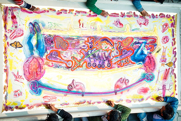 Through my work, I was playing a game of "ping-pong" with the craftsmen: I started a drawing - ink interventions on the fabric - then the artisans embroidered it, and I transformed the drawing again, and so on throughout the creative process. The starting point is a bestiary that is half human half animal, freely inspired by fairy tales, but also by the history of Lucknow city, as well as its embroidery techniques.