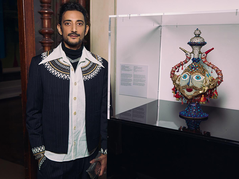 During his residency at the Manufactures Nationales, Kunaal Kyhaan Seolekar created a conceptual reinterpretation of the historic Buire Indienne (water vessel) from the Sèvres archives, transforming the original Mughal-inspired vessel into a sculptural, totemic object that bridges Indo–French material lineages. His contemporary Buire is here covered with a richly embroidered “second skin,” produced in close collaboration with master artisans at Ateliers 2M, who undertook the challenge of realizing this three-dimensional textile sculpture. Using zardozi, kantha, beadwork, ceremonial stitching, lace, and sacred thread, the piece merges precious and synthetic materials into a “relic of the future”.