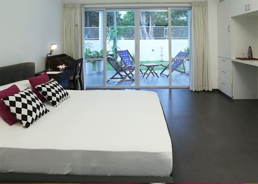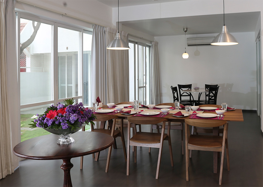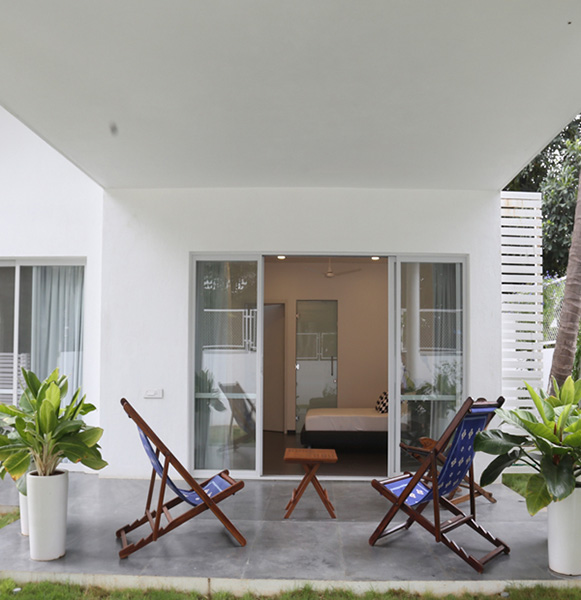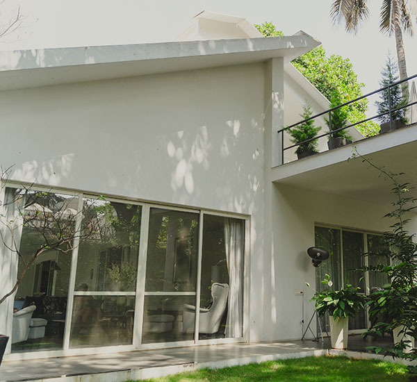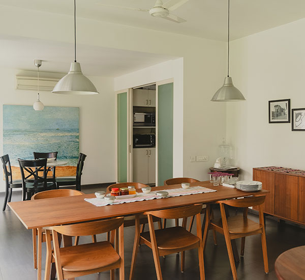 Sangam House is located at The Jamun, a spacious bungalow complex co-designed by French interior designer Dominic Dube. Sangam House offers a calm and quiet environment with easy access to the city centre. It is located in a green lane facing a park, with giant jamun trees in the front garden. The rooms are inundated with sun and offer access to pleasant balconies and outdoor terraces.