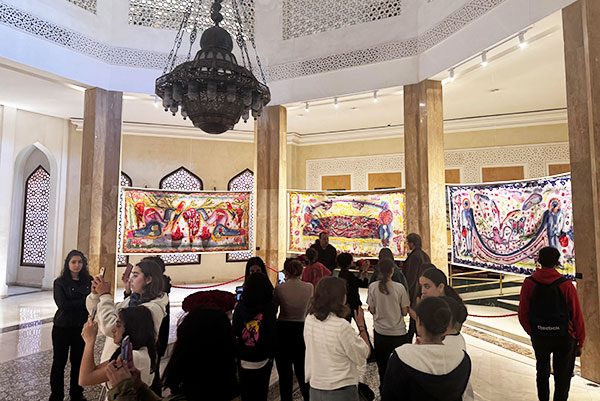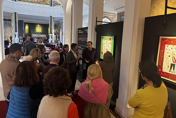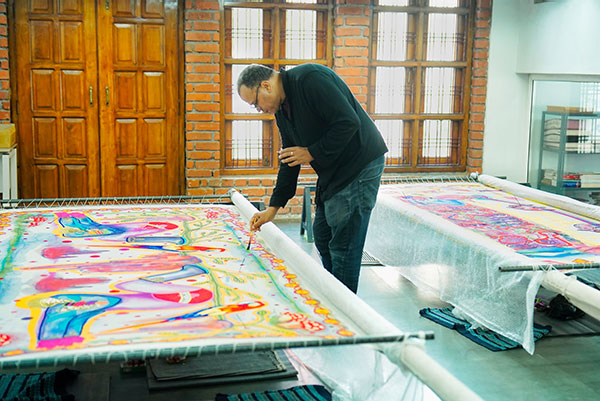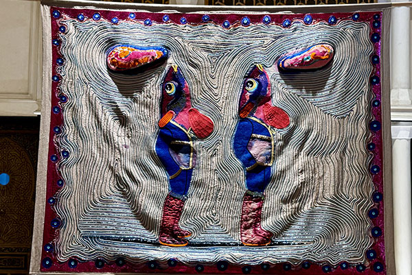 Yassine Balbzioui, a Moroccan multidisciplinary visual artist born in 1972, is known for his neo-expressionist works that explore themes of human animality, derision, and the grotesque, often using masks as a central motif. A graduate of the École des Beaux-Arts in Casablanca and Bordeaux, he draws inspiration from everyday life, cinema, theater, and folklore. His work has been exhibited globally, including at the Reina Sofia Museum in Madrid and the 13th Dakar Biennial. During his residency at Villa Swagatam, Balbzioui created 11 artworks combining drawing, painting, and embroidery, inspired by fairy tales from Lucknow, in collaboration with 21 artisans from the Kalhath Institute. These works were exhibited after his residency at Es Saadi Palace in Marrakech as part of the 1-54 Contemporary Art Fair. On July 12, 2024, his embroidered tapestries ‘Twin Bubbles’ made their European debut at the Subversive Threads festival, in collaboration with Neuer Kunstverein Mittelrhein, at Artist Residency Schloss Balmoral.